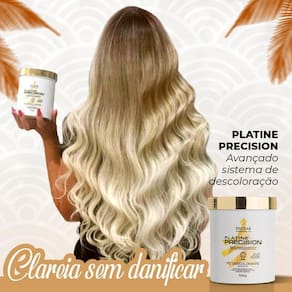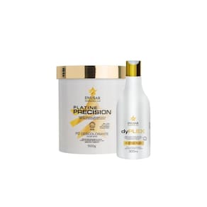168745/2019-34 O pó descolorante platine precision white abre até 10 tons e proporciona um resultado uniforme, proteção, hidratação, sedosidade e brilho. Modo de usar: acrescente a medida desejada do pó descolorante em um recipiente não metálico. Adicione o oxidante aos poucos e misture até formar um creme homogêneo, sempre na proporção 1: 2 uma medida de pó para duas medidas de ox . Siga rigorosamente as instruções de uso e faças testes de toque e mechas antes de aplicar. Após o término do tempo de ação, enxágue bem com água morna e lave os cabelos como de costume. Hidratar para melhor resultado. Teste de mecha: separe uma mecha fina do alto da cabeça, misture um pouco do produto e aplique na mecha, deixando o tempo de ação indicado e então a lave. Respeite a proporção utilizada na prova do toque. Se o cabelo ficar quebradiço ou houver aquecimento, é sinal de que o seu cabelo não se encontra em condições para o uso do produto. Atenção não utilize água oxigenada acima de 13 volumes para clareamento de pelos do corpo sem proteção prévia da pele. O dy plex protetor de descoloração dyusar cosméticos 300 ml, é um restaurador capilar que proporciona proteção nos processos de coloração e descoloração.168745/2019-34 Modo de usar: adicione de 10 a 12 ml do plex a um recipiente de coloração ou descoloração e siga corretamente o passo a passo e as recomendações correspondentes ao produto utilizado. Marca: Dyusar Cosmeticos