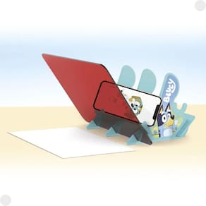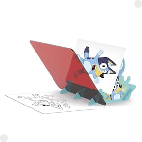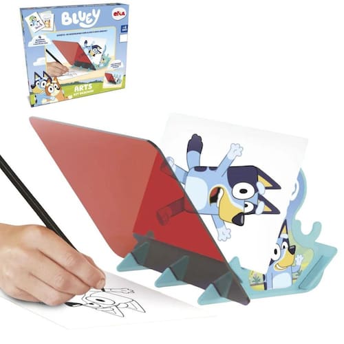 Com Art Kids do Bluey é possível copiar qualquer desenho, o kit vem com 4 desenhos da família do Bluey e 1 lápis, além da peça acrílica e do suporte para se fazer os desenhos. Na caixa do produto vem um QR code no qual é possível baixar mais desenhos do personagem. A criança pode copiar também os desenhos da tela do tablet ou celular.