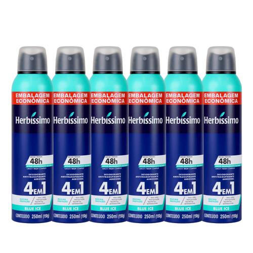 Desodorante Aerosol Antitranspirante Herbíssimo Blue Ice O Desodorante Aerosol Antitranspirante Herbíssimo Blue Ice proporciona um agradável toque seco e proteção intensiva perfumada, com até 48 horas de eficácia. Este produto é indicado para eliminar os odores desagradáveis produzidos pelo organismo durante a transpiração. Características:4 em 1: Combate o mau odor, controla a transpiração/suor, elimina apenas as bactérias ruins presentes nas axilas e evita manchas brancas em roupas pretas, além de manchas amarelas em roupas brancas.Fórmula Avançada: Garante até 48 horas de proteção desodorante e perfume, graças a uma tecnologia que libera gradativamente compostos naturais como Salix Alba (Willow) Bark Extract e 4-terpineol, que protegem e cuidam das axilas, tornando a pele mais saudável.Green Tech Complex: Um complexo ativo exclusivo extraído da natureza, que promove proteção contínua e cuidado com a pele, eliminando apenas as bactérias causadoras do mau odor.Especificações:Conteúdo: 150 mlImportante: Inofensivo para a camada de ozônio. Não contém CFC.Precauções:Inflamável. Não pulverizar perto do fogo.Não perfurar nem incinerar.Não expor ao sol nem a temperaturas superiores a 50ºC.Usar somente nas axilas e proteger os olhos durante a aplicação.Manter fora do alcance de crianças.Evitar inalação deste produto.Usar somente nas áreas indicadas.Não aplicar sobre a pele irritada ou lesionada.Caso ocorra irritação e/ou prurido no local da aplicação, suspender o uso imediatamente.Uso externo. Não ingerir.Não deixar embalagem de aerosol dentro de veículos, pois há risco de vazamento e explosão.