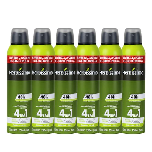 Desodorante Aerosol Antitranspirante Herbíssimo Green Leaf O Desodorante Aerosol Antitranspirante Herbíssimo Green Leaf proporciona um agradável toque seco e proteção intensiva perfumada, com 48 horas de proteção. Indicado para eliminar os odores desagradáveis produzidos pelo organismo e eliminados pela transpiração, este produto oferece 4 em 1: combate o mau odor, controla a transpiração/suor, elimina apenas as bactérias ruins presentes nas axilas e evita manchas brancas e amareladas nas roupas. Sua fórmula garante até 48 horas de proteção desodorante e perfume, graças a uma tecnologia que libera de forma gradativa os compostos naturais, como Salix Alba (Willow) Bark Extract e 4-terpineol, que protegem e cuidam das axilas, tornando a pele mais saudável. O Green Tech Complex é um complexo ativo exclusivo extraído da natureza, que promove proteção contínua e cuidado com a pele, eliminando apenas as bactérias causadoras do mau odor de forma gradativa, no momento em que você mais precisa. Importante: inofensivo para a camada de ozônio e não contém CFC. Especificações:Conteúdo: 150 mlPrecauções:Inflamável. Não pulverizar perto do fogo.Não perfurar nem incinerar.Não expor ao sol nem a temperaturas superiores a 50ºC.Usar somente nas axilas e proteger os olhos durante a aplicação.Manter fora do alcance de crianças.Evitar inalação deste produto.Usar somente nas áreas indicadas.Não aplicar sobre a pele irritada ou lesionada.Caso ocorra irritação e/ou prurido no local da aplicação, suspender o uso imediatamente.Uso externo. Não ingerir.Não deixar embalagem de aerosol dentro de veículos, pois há risco de vazamento e explosão.