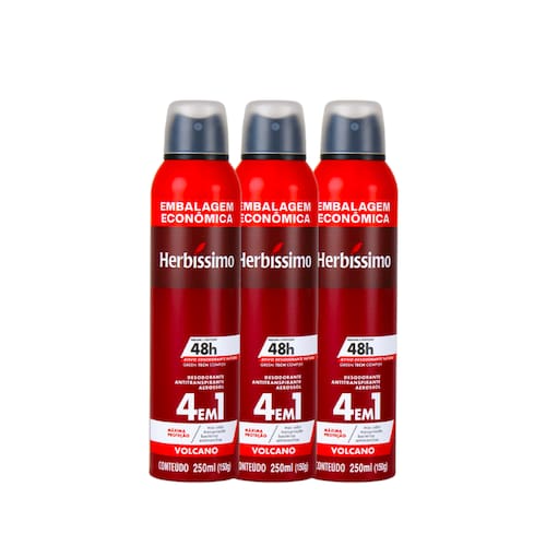 Desodorante Aerosol Antitranspirante Herbíssimo Volcano O Desodorante Aerosol Antitranspirante Herbíssimo Volcano proporciona um agradável toque seco e proteção intensiva perfumada, com 48 horas de proteção. Indicado para eliminar os odores desagradáveis produzidos pelo organismo e eliminados pela transpiração, este produto oferece 4 em 1: combate o mau odor, controla a transpiração/suor, elimina apenas as bactérias ruins presentes nas axilas e evita manchas brancas e amareladas nas roupas. Sua fórmula garante até 48 horas de proteção desodorante e perfume, graças a uma tecnologia que libera de forma gradativa os compostos naturais, como Salix Alba (Willow) Bark Extract e 4-terpineol, que protegem e cuidam das axilas, tornando a pele mais saudável. O Green Tech Complex é um complexo ativo exclusivo extraído da natureza, que promove proteção contínua e cuidado com a pele, eliminando apenas as bactérias causadoras do mau odor de forma gradativa, no momento em que você mais precisa. Importante: inofensivo para a camada de ozônio e não contém CFC. Especificações:Conteúdo: 150 mlPrecauções:Inflamável. Não pulverizar perto do fogo.Não perfurar nem incinerar.Não expor ao sol nem a temperaturas superiores a 50ºC.Usar somente nas axilas e proteger os olhos durante a aplicação.Manter fora do alcance de crianças.Evitar inalação deste produto.Usar somente nas áreas indicadas.Não aplicar sobre a pele irritada ou lesionada.Caso ocorra irritação e/ou prurido no local da aplicação, suspender o uso imediatamente.Uso externo. Não ingerir.Não deixar embalagem de aerosol dentro de veículos, pois há risco de vazamento e explosão.