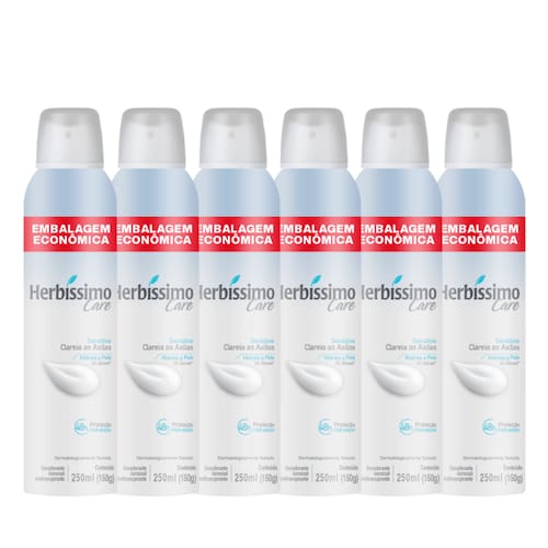 Desodorante Aerossol Antitranspirante Herbíssimo Care Sensitive é formulado com uma exclusiva tecnologia clareadora que cuida da pele, promovendo uma aparência uniforme e mantendo as axilas lindas e saudáveis. Ele clareia as axilas, hidrata a pele e oferece 48 horas de proteção e hidratação, sendo dermatologicamente testado e livre de álcool. Especificações:0% ÁlcoolProteção e hidratação por 48 horasDermatologicamente testadoPrecauções:Inflamável. Não pulverizar perto do fogo.Não perfurar nem incinerar.Não expor ao sol nem a temperaturas superiores a 50ºC.Usar somente nas axilas e proteger os olhos durante a aplicação.Manter fora do alcance de crianças.Evitar inalação deste produto.Usar somente nas áreas indicadas.Não aplicar sobre a pele irritada ou lesionada.Caso ocorra irritação e/ou prurido no local da aplicação, suspender o uso imediatamente.Não deixar embalagem de aerossol dentro de veículo, pois há risco de vazamento e explosão.Importante: Inofensivo para a camada de ozônio. Não contém CFC.Uso externo. Não ingerir.