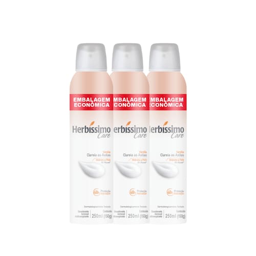 O Desodorante Aerossol Antitranspirante Herbíssimo Care Vanilla é formulado com uma exclusiva tecnologia clareadora que cuida da pele, mantendo as axilas lindas e saudáveis. Ele clareia as axilas, hidrata a pele e oferece 48 horas de proteção e hidratação, sendo dermatologicamente testado e livre de álcool. Especificações:0% ÁlcoolProteção e hidratação por 48 horasDermatologicamente testadoPrecauções:Inflamável. Não pulverizar perto do fogo.Não perfurar nem incinerar.Não expor ao sol nem a temperaturas superiores a 50ºC.Usar somente nas axilas e proteger os olhos durante a aplicação.Manter fora do alcance de crianças.Evitar inalação deste produto.Usar somente nas áreas indicadas.Não aplicar sobre a pele irritada ou lesionada.Caso ocorra irritação e/ou prurido no local da aplicação, suspender o uso imediatamente.Não deixar embalagem de aerossol dentro de veículo, pois há risco de vazamento e explosão.Importante: Inofensivo para a camada de ozônio. Não contém CFC.Uso externo. Não ingerir.