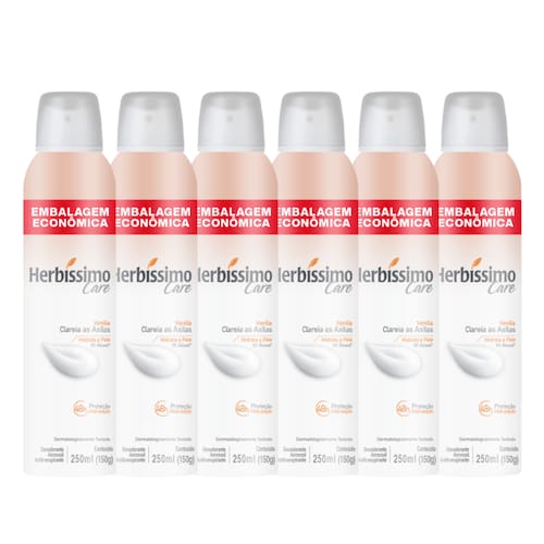 O Desodorante Aerossol Antitranspirante Herbíssimo Care Vanilla é formulado com uma exclusiva tecnologia clareadora que cuida da pele, mantendo as axilas lindas e saudáveis. Ele clareia as axilas, hidrata a pele e oferece 48 horas de proteção e hidratação, sendo dermatologicamente testado e livre de álcool. Especificações:0% ÁlcoolProteção e hidratação por 48 horasDermatologicamente testadoPrecauções:Inflamável. Não pulverizar perto do fogo.Não perfurar nem incinerar.Não expor ao sol nem a temperaturas superiores a 50ºC.Usar somente nas axilas e proteger os olhos durante a aplicação.Manter fora do alcance de crianças.Evitar inalação deste produto.Usar somente nas áreas indicadas.Não aplicar sobre a pele irritada ou lesionada.Caso ocorra irritação e/ou prurido no local da aplicação, suspender o uso imediatamente.Não deixar embalagem de aerossol dentro de veículo, pois há risco de vazamento e explosão.Importante: Inofensivo para a camada de ozônio. Não contém CFC.Uso externo. Não ingerir.