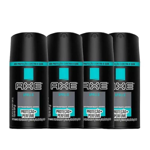 O Kit Desodorante Antitranspirante Aerosol Axe Apollo 150ml - 4 Unidades foi desenvolvido para novos homens que possui uma vida agitada, com isso a axe criou uma mistura entre sálvia com frutas cítricas e de flores com tons amadeiradas, tudo para uma fragrância viciante entre o frescor e o quente.