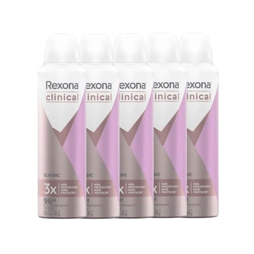 O Kit Desodorante Antitranspirante Aerosol Rexona Clinical Classic 91g - 5 Unidades oferece 3X mais proteção que o antitranspirante comum, com alta qualidade oferece proteção avançada e duradoura contra a transpiração e o mau odor. O excesso de transpiração e o mau odor podem ser um empecilho na vida de muitas pessoas, o sentimento de desconforto toma conta nessas situações. Pensando nisso, Rexona desenvolveu Rexona Clinical Aerosol, que combina três vezes mais proteção que um antitranspirante comum com ingrediente hidratante para o cuidado da pele. Com uma inovadora fórmula termo-ativa e exclusiva tecnologia Defense+, que se adapta ao organismo, ajudando a prevenir a transpiração e o mau odor papara mulheres que precisam de máxima proteção.