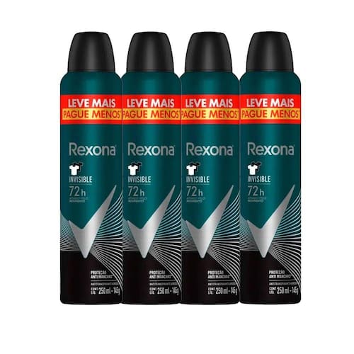 O Kit Desodorante Antitranspirante Aerosol Rexona Invisible Men 72 horas 250ml - 4 Unidades foi desenvolvido com tecnologia de ponta garantindo máxima proteção contra a transpiração e o mau odor, para que você possa fazer mais e enfrentar os desafios do dia a dia. Mais uma vez Rexona se supera e relança sua linha de desodorantes com uma fórmula inovadora, que combina um novo e exclusivo ativo antitranspirante com a tecnologia de fragrâncias encapsuladas.