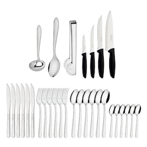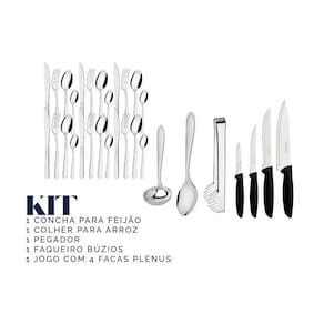 1 faqueiro búzios 24pçs 1 concha para feijão 1 colher para arroz 1 pegador de massas 4 facas plenus