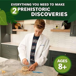 Os amantes de dinossauros se alegram! Este kit contém duas atividades pré-históricas emocionantes em um pacote conveniente. Primeiro, siga as instruções para fazer seus próprios ovos de dinossauro e depois escave os fósseis lá dentro como um verdadeiro paleontólogo faria! Este kit prático ajuda jovens cientistas em treinamento a aprenderem enquanto jogam.