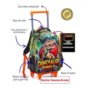 Com o Kit Escola Dinossauro, as crianças vão se encantar com a estampa estilizada e se sentirão animadas para ir à escola. Além disso, a praticidade e organização proporcionadas pela mochila com rodas, lancheira térmica e estojo irão facilitar o dia a dia dos pequenos.