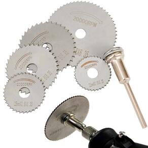 Jogo 5 em 1 mini disco de serra em HSS para retífica (01 conjunto)- Ideal para cortar PVC, Plasticos, Madeira, Metais Leves e Aluminio- Compativel com Parafusadeira, Furadeiras, Micro E Mini Retífica.- Jogo Lâmina de Serra para Retífica Furadeira 6 Peças. Kit de discos de corte para madeira, lâminas de serra para micro retíficas, retificadoras e furadeiras- Kit Acompanha 5 Serras e 1 Madril Haste- A instalação é rápida e fácil, sendo a escolha perfeita para automatizar e agilizar seus trabalhos com eficiência, e economizando seu tempo e energia.- É o kit perfeito para artesanatos, marcenaria e obras, ideal para cortar materiais como madeira, plásticos, PVC, alumínio e metais leves. Com discos de tamanhos variados, permite cortes personalizados, sendo perfeito para vários tipos de serviços.- Feitos 100% em aço de alta velocidade, esses discos são duráveis, resistentes ao desgaste e garantem cortes precisos.- Kit de discos de serras para micro retíficas, furadeiras e parafusadeiras! Perfeita para o dia a dia.Uma nova experiência em cortes no seu dia a dia!Jogo incrível de disco de corte circular para retíficas e micro retífica,100% em aço HSS (aço de alta velocidade) o disco tem dentes perfeitamente projetado para trabalhos com Madeira, plásticos, laminados, piso vínicos, alumínios e até metal de baixa espessura.Ideal para uso em artesanatos, marcenaria e até mesmo na obra.Disco suporta rotação de até 20.000 rpm, a velocidade é aliada de um bom corte com segurança e eficiência.Ideal para Madeira, Plasticos, PVC, aluminio e Metais Leves.Todos os discos têm gravação das dimensões e capacidade de rotação, o que facilita o dia a dia e separação do disco desejado.Pode ser colocado em furadeira ou parafusadeira, mas nesses casos deve-se tomar cuidado com trancos e com o avanço da serra no material, pois essas ferramentas não tem velocidade de rotação tão grandes.Conteúdo:Disco 22 mm (7/8");Disco 25 mm (1");Disco 32 mm (1.1/4");Disco 35 mm (2-1/2")Disco 44 mm (1.3/4").Mandril haste 3,2 mm (1/8")Características técnicasHaterial: HSSRotação Máxima: 20.000 rpm (nunca ultrapassar)Para sua Segurança: Utilize sempre óculos e luvas de proteçãoconteúdo da embalagem: 5 discos + 1 mandril