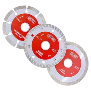 Marca: RocastO Kit Disco Diamantado Segmentado - Turbo - Liso com 3 pçs 34,0018 - Rocast, acompanha 1 Disco diamantado segmentado, ideal para cortes de materiais mais robustos, como concreto, tijolo, telha e alvenaria, 1 Disco diamantado turbo, ideal para realizar cortes em materiais como mármores, granitos, pedras decorativas e alvenaria e 1 Disco diamantado liso, ideal para cortar pedras, azulejos, cerâmica e porcelanato.