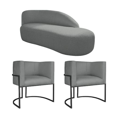 Kit Divã Luna 185cm Lado Direito E 02 Poltronas Base De Ferro Preto Suede Cinza