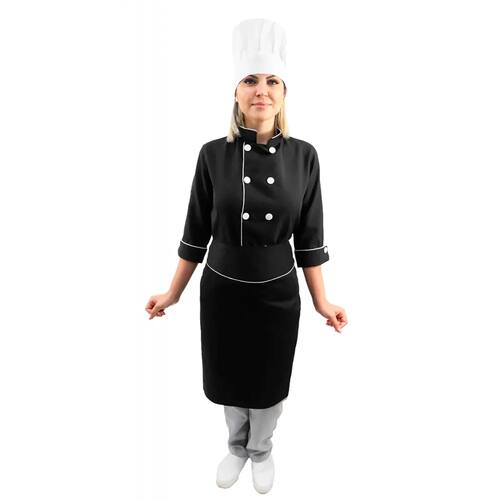 Kit Dolmã 3/4 Chapéu avental chef de cozinha feminino - P - Preto
