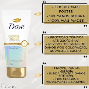 O creme Leave-In Dove Bond Intense Repair possui Bio-Protein Care +6% Peptídeo Complex, nova tecnologia com proteína 100% compatível à estrutura natural do seu cabelo, penetra e age em harmonia com a fibra capilar para reparar continuamente os sinais de danos, até os mais extremos.