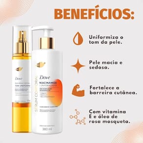 O Kit Dove Tom Uniforme proporciona hidratação intensa e duradoura, contribuindo para uma pele macia e suave ao toque. Sua formulação avançada trabalha para uniformizar o tom da pele, reduzindo imperfeições e realçando a luminosidade natural. Desfrute de uma pele nutrida e com aspecto saudável.