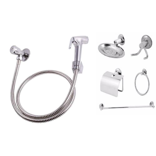 Kit acessórios para Banheiro aço inox 5 Peças e Ducha Higiênica Cromada Luxo Inox 01 Porta Toalha de banho 45 cm01 Porta Toalha de Rosto01 Saboneteira01 Papeleira01 Cabide duplo01 Ducha higiênica luxo cromadaFixação dupla: acompanha parafusos e buchasObs: o kit de acessórios possui 5 peças, sendo composto pelos seguintes materiais:A papeleira porta papel higiênico e a saboneteira são produzidas em aço inox, o porta toalha de banho e o porta toalha de rosto e o cabide gancho são produzidos em alumínio anodizado e polido e as canoplas são de aço inox.Garantia 02 anos Marca: Austrália