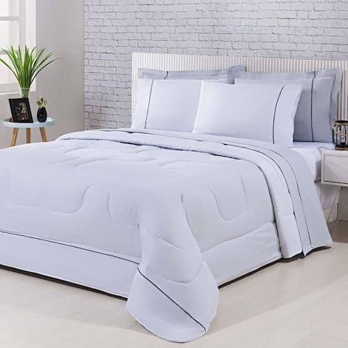 O Edredom Gran Moratta é confeccionado com tecido Percal 100% Algodão, é dupla face, ou seja, pode ser dos dois lados, sendo um com detalhe em jogo de cama possui tecido Percal 100% Algodão, acompanha lençol de baixo, lençol de cima e combinação perfeita para suas noites de sono! Produto composto por: 01 Edredom 2,40m x 2,90m02 Porta Travesseiro 70cm x 50cm01 Lençol de Cima 2,40m x 2,90m 01 Lençol de Baixo para Colchão 1,93m x 2,03m x 0,40m02 Fronhas 70cm x 50cm Composição: Percal 150 Fios 100% AlgodãoEnchimento 100% Poliéster (120 Gramas)