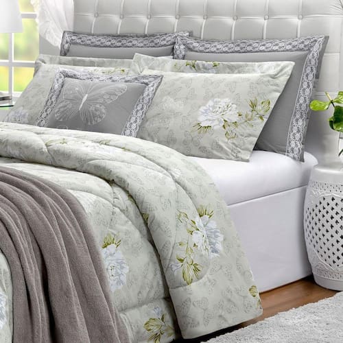 Kit edredom butterfly queen dupla face 7 peças Utilizamos matérias-prima de excelente qualidade que resistem à processo de lavagem, mantendo a beleza e durabilidade do produto. Contém na embalagem:01 edredom: 2,60m comprimento x 2,40m largura 02 porta travesseiros com renda: 75cm comprimento x 55cm largura 02 porta travesseiros estampados: 75cm x 55cm01 capa almofada bordada: 45cm x 45cm01 refil de almofada 40cm x 40cmComposição: Edredom tecido superior: 80% algodão - 20% poliésterEnchimento: 100% poliésterTecido inferior: 100% poliésterPorta travesseiros e almofadas: tecido 80% algodão - 20% poliéster - 180 fiosAs cores podem mudar de acordo com o monitor. fique atento à descrição do produto.