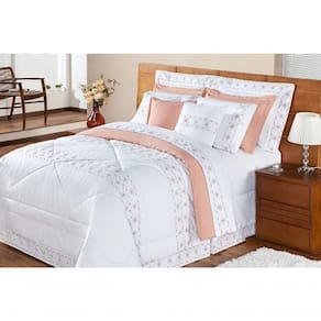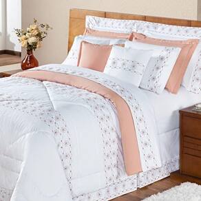 Kit Edredom Damasco Queen 11 Peças 100% Poliéster 200 Fios - Branco/salmao
