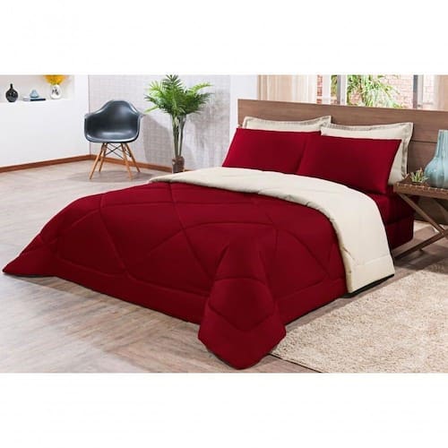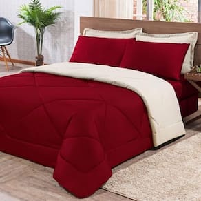 Kit Edredom + Jogo De Lençol Aconchego Look House Dupla Face Casal Queen 06 Peças - Vermelho E Palha O Kit Look House, traz para seu ambiente um conjunto de roupas de cama com todas as peças que você precisa para deixar seu ambiente aconchegante, sem contar o conforto para as noites de sono. Produto composto por: 01 Edredom 2,50m x 2,20m 01 Lençol de baixo c/ elástico para colchão de 1,58m x 1,98m x 0,30cm 02 Porta travesseiros 70cm x 50cm 02 Fronhas de 70cm x 50cm Composição tecido: 80% Algodão / 20% Poliéster Marca: Enxovais Davy | Estampa: Não se Aplica | Medidas: 01 Edredom 2,50m x 2,20m01 Lençol de baixo c/ elástico para colchão de 1,58m x 1,98m x 0,30cm02 Porta travesseiros 70cm x 50cm02 Fronhas de 70cm x 50cm | Número de Peças: 06 Peças | Material: Poliéster | Cor Predominante: Vermelho E Palha | Cama Indicada: Queen