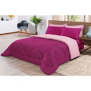 Kit Edredom + Jogo De Lençol Aconchego Look House Dupla Face Casal King 06 Peças - Pink E Rosa