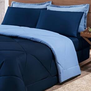 Kit Edredom + Jogo De Lençol Aconchego Look House Dupla Face Casal Queen 06 Peças - Azul Marinho E Azul