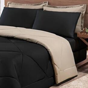 Kit Edredom + Jogo De Lençol Aconchego Look House Dupla Face Casal Queen 06 Peças - Preto/ Caqui