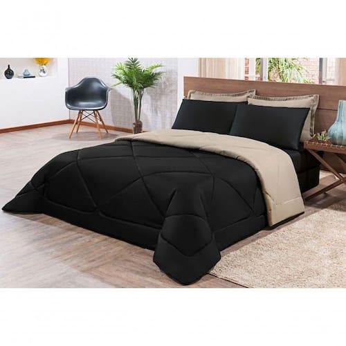 Kit Edredom + Jogo De Lençol Aconchego Look House Dupla Face Casal Queen 06 Peças - Preto/ Caqui