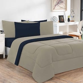 Kit Edredom + Jogo De Lençol Malha 100% Algodão Gran Moratta 6 Peças Casal - Avelã/azul Marinho