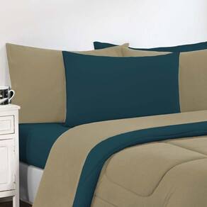 Marca: Enxovais Davy | Estampa: Não se Aplica | Medidas: 01 Edredom King Dupla Face Liso 2,50m x 2,90m02 Porta Travesseiros 70cm x 50cm01 Lençol de Cima 2,50m x 2,90m 01 Lençol Casal de Baixo para colchão 1,93m x 2,03m x 0,30m (Elástico na volta toda)02 Fronhas 70cm x 50cm | Número de Peças: 07 Peças | Material: Agodão | Cor Predominante: Avelã/Azul Petróleo | Cama Indicada: King