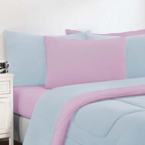 O jogo de cama possui o toque suave do algodão, acompanha lençol de baixo, lençol de cima e fronhas.