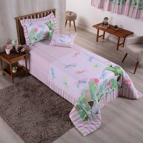 Kit Edredom Juvenil Solteiro 04 Peças Estampado 300 Fios - Libé - 100% Poliéster - Blush