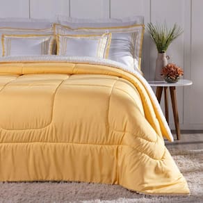 A fronha possui um debrum estampado em três lados, adicionando um acabamento elegante, enquanto a capa de almofada conta com debrum em todos os lados e fechamento em zíper para mais praticidade. O coberdrom é costurado nas bordas, garantindo que a manta interna fique sempre no lugar, mesmo após o uso.