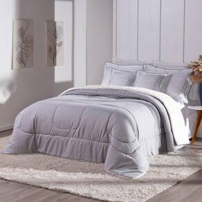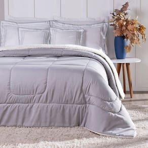 A fronha possui um debrum estampado em três lados, adicionando um acabamento elegante, enquanto a capa de almofada conta com debrum em todos os lados e fechamento em zíper para mais praticidade. O coberdrom é costurado nas bordas, garantindo que a manta interna fique sempre no lugar, mesmo após o uso.