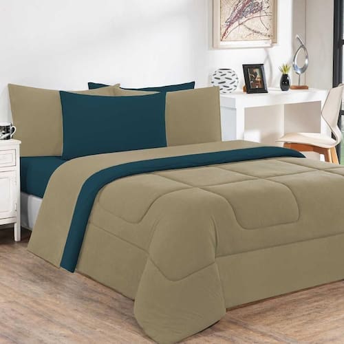 Marca: Enxovais Davy | Estampa: Não se Aplica | Medidas: 01 Edredom Queen Dupla Face Liso 2,20m x 2,40m02 Porta Travesseiros 70cm x 50cm | de Peças: 03 Peças | Material: Agodão | Cor Predominante: Avelã/Azul Petróleo | Cama Indicada: Queen