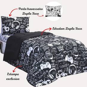 Kit Edredom Solteiro Micropercal 200 fios Infantil Dupla Face Game 3 peças Preto O Kit Edredom solteiro Game foi produzido pensando no conforto e diversão do seu filho a . Sendo o Edredom e o Porta Travesseiro dupla face possuindo duas versões diferentes em um só Kit.
