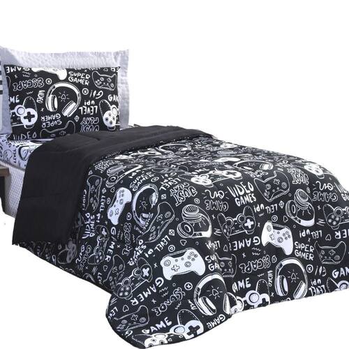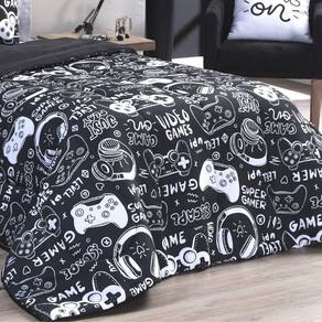 Kit Edredom Solteiro Micropercal 200 fios Infantil Dupla Face Game 3 peças Preto O Kit Edredom solteiro Game foi produzido pensando no conforto e diversão do seu filho a . Sendo o Edredom e o Porta Travesseiro dupla face possuindo duas versões diferentes em um só Kit.