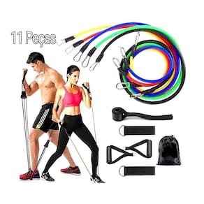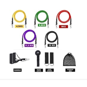 Por exemplo, somente a amarela tem 4,5kgs. Já a verde tem 6,8kg. Usando as duas juntas, você terá 11,3kgs de tensão para ir aumentando a intensidade dos seus treinos!