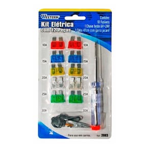 O kit elétrica é muito importante para a segurança do automóvel, pois basta qualquer ameaça de curto circuito que eles interrompem a energia. Por isso, eles são fundamentais e devem ser substituídos sempre que apresentarem algum defeito. Marca: Western Características: -composição: Zinco, AS plástico , aço carbono, ferro. Conteúdo: -1 Chave de teste 6V 24V. -1 Cabo 47cm com garra jacaré. -2 Fusíveis vermelhos 10A. -2 Fusíveis azuis 15A. -2 Fusíveis amarelos 20A. -2 Fusíveis cristal 25A. -2 Fusíveis verdes 30A. Aplicação: Ideal para uso em carros. Código: 2963 Ean: 7897186059471