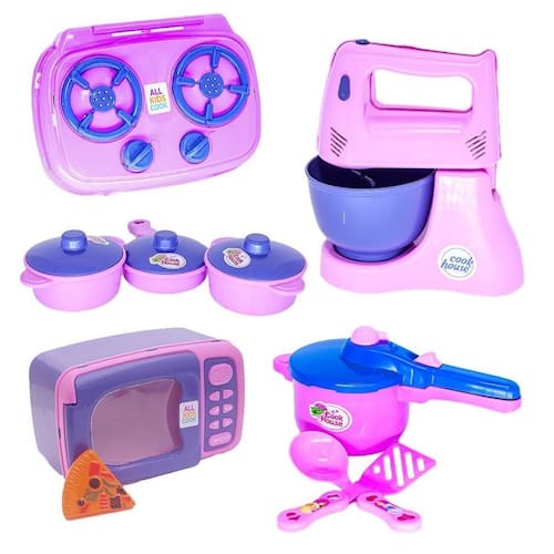 o kit vem com microondas com acessório , fogão cooktop, batedeira, panelinha de pressão com acessórios , jogo de panelinhas