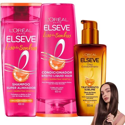 Kit Elseve Liso dos Sonhos Extraordinário Queratina 400ml Bem vindo a a loja Flocus. É um prazer tê-lo a como nosso a cliente CONTEÚDO DO KIT: 1 Elseve Shampoo Super Alinhador Liso dos Sonhos Loreal Paris - 400ml 1 Elseve Condicionador Efeito Liquid Hair Liso dos Sonhos Loreal Paris - 400ml 1 Óleo Extraordinário L'Oréal Paris Elseve - 100ml Chegooou A nova linha Elseve Liso dos Sonhos proporciona cabelos lisos, alinhados e sem frizz por 1 semana O Shampoo Super Alinhador limpa e fortalece a fibra preparando os fios para um liso de longa duração e com frizz controlado. O Condicionador Efeito Liquid Hair sela e restaura a superfície da fibra para um liso com efeito liquid hair: desmaiado, com movimento superfluido e brilho intenso. Resultados que resistem até 5 lavagens Para turbinar seu tratamento capilar, o kit contém o famoso e um dos mais vendidos Óleo de Tratamento Elseve Óleo Extraordinário Nutrição, pois ele tem a combinação perfeita de micro-óleos de flores preciosas, garantindo maciez e brilho aos cabelos. O segredo dos óleos de flores preciosas promovem uma nutrição perfeita e uma leveza infinita. Camomila Linhaça Girassol Gardênia Lótus Rosa Canina INDICAÇÃO: Cabelos naturalmente lisos, alisados e com frizz. MODO DE USO: Shampoo: Aplique em todo o comprimento, até as pontas. Deixe o produto agir e enxágue abundantemente. Condicionador: Aplique nos cabelos molhados Massageie suavemente e enxágue. Repita a aplicação se necessário. Óleo Extraordinário: O Óleo Extraordinário de tratamento é leve e multiuso, pode ser tanto em cabelos molhados quanto secos Pode ser antes da escova para nutrir os fios; como finalizador para malear a fibra; em qualquer momento para disciplinar o frizz e ressaltar a luz dos cabelos. Agradecemos por escolher a Loja Flocus e por confiar em nós para cuidar da beleza dos seus cabelos. Em caso de dúvidas, favor enviar sua pergunta Flocus Marca: Não Informado Ean: 7735118889027