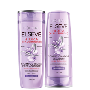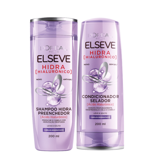 Kit com shampoo e condicionador para cabelos desidratados. Elseve L'Oréal Paris Hidra Hialurônico Duo preenche a fibra capilar durante o cuidado diário com os fios, além de proporcionar um visual mais bonito e saudável.