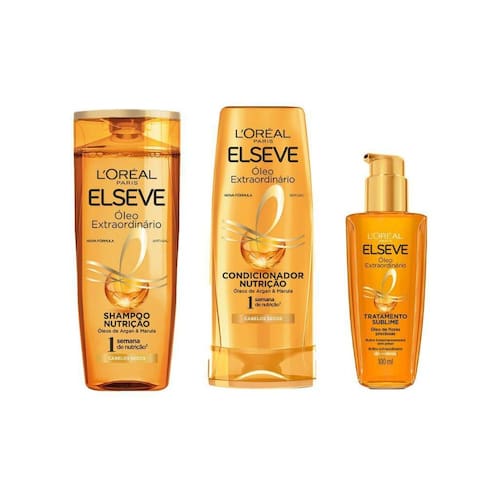 Kit Elseve Oleo Extraordinario 1 Condicionador 400ml + 1 Shampoo 400ml + Óleo 100ml Descrição Shampoo Elseve Óleo Extraordinário O Shampoo Elseve Óleo Extraordinário oferece uma limpeza suave enquanto hidrata profundamente os fios. Sua fórmula, enriquecida com óleos de flores preciosas como camélia, argan e flores de tiaré, ajuda a restaurar a maciez e o brilho dos cabelos, além de controlar o frizz. Ideal para cabelos secos e opacos, o shampoo proporciona um toque sedoso e leveza, sem pesar os fios. Condicionador Elseve Óleo Extraordinário O Condicionador Elseve Óleo Extraordinário foi formulado para cabelos secos e sem brilho. Sua fórmula rica em óleos de flores preciosas nutre profundamente, proporcionando cabelos mais hidratados, brilhantes e com um toque sedoso. Ele ajuda a desembaraçar os fios, deixando-os mais leves e com controle do frizz, sem pesar. Óleo Elseve Óleo Extraordinário O Óleo Elseve Óleo Extraordinário é um tratamento concentrado que proporciona nutrição intensa aos fios. Ele pode ser antes ou após a lavagem, para hidratar, suavizar e dar brilho aos cabelos. Sua fórmula leve, com óleos de flores preciosas, ajuda a controlar o frizz, proporcionar maciez e brilho radiante, sem pesar ou deixar os fios oleosos. Modo de Uso Lave os cabelos com o shampoo, massageando o couro cabeludo e os fios até formar espuma. Enxágue bem. Aplique o condicionador nos cabelos úmidos, distribuindo-o ao longo dos fios, com foco nas pontas. Deixe agir por alguns minutos e enxágue bem. Use o óleo conforme desejado: Antes de lavar: Aplique no cabelo seco ou úmido, deixe agir por 10-15 minutos e depois lave normalmente. Após lavar: Aplique algumas gotas do óleo nos cabelos úmidos ou secos para dar brilho e suavidade, sem enxágue. Marca: Não Informado