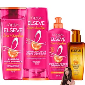 Kit Elseve Óleo Extraordinário Liso dos Sonhos AHA Queratina Bem vindo a a loja Flocus. É um prazer tê-lo a como nosso a cliente CONTEÚDO DO KIT: 1 Elseve Shampoo Super Alinhador Liso dos Sonhos Loreal Paris - 400ml 1 Elseve Condicionador Efeito Liquid Hair Liso dos Sonhos Loreal Paris - 400ml 1 Elseve Creme para Pentear Extermina Frizz Liso dos Sonhos Loreal Paris - 250ml 1 Óleo Extraordinário L'Oréal Paris Elseve - 100ml Chegooou A nova linha Elseve Liso dos Sonhos proporciona cabelos lisos, alinhados e sem frizz por 1 semana O Shampoo Super Alinhador limpa e fortalece a fibra preparando os fios para um liso de longa duração e com frizz controlado. O Condicionador Efeito Liquid Hair sela e restaura a superfície da fibra para um liso com efeito liquid hair: desmaiado, com movimento superfluido e brilho intenso. O Creme para pentear Extermina Frizz desembaraça e combate a umidade para um liso com frizz controlado por até 72h, desde a primeira aplicação. Com filtro UV e proteção térmica, o Creme para Pentear Extermina Frizz é a solução para um cabelo alinhado e livre de frizz. Resultados que resistem até 5 lavagens Para turbinar seu tratamento capilar, o kit contém o famoso e um dos mais vendidos Óleo de Tratamento Elseve Óleo Extraordinário Nutrição, pois ele tem a combinação perfeita de micro-óleos de flores preciosas, garantindo maciez e brilho aos cabelos. O segredo dos óleos de flores preciosas promovem uma nutrição perfeita e uma leveza infinita. Camomila Linhaça Girassol Gardênia Lótus Rosa Canina INDICAÇÃO: Cabelos naturalmente lisos, alisados e com frizz. MODO DE USO: Shampoo: Aplique em todo o comprimento, até as pontas. Deixe o produto agir e enxágue abundantemente. Condicionador: Aplique nos cabelos molhados Massageie suavemente e enxágue. Repita a aplicação se necessário. Creme para Pentear: Aplique no cabelo úmido ou seco Não enxágue. Penteie como de costume. Óleo Extraordinário: O Óleo Extraordinário de tratamento é leve e multiuso, pode ser tanto em cabelos molhados quanto secos Pode ser antes da escova para nutrir os fios; como finalizador para malear a fibra; em qualquer momento para disciplinar o frizz e ressaltar a luz dos cabelos. Agradecemos por escolher a Loja Flocus e por confiar em nós para cuidar da beleza dos seus cabelos. Em caso de dúvidas, favor enviar sua pergunta Flocus Marca: Não Informado