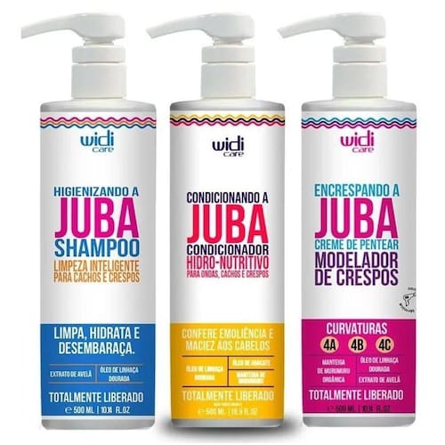 Kit encrespando a juba shampoo e condicionador widi care Kit encrespando a juba shampoo e condicionador wid care Este kit contém: - higienizando a juba shampoo 500ml - condicionando a juba 500ml - encrespando a juba creme de pentear 500ml Higienizando a juba shampoo 500mlO que é Essa história que shampoo resseca e embola cabelo cacheado e crespo é coisa do passado o higienizando a juba é um shampoo com tecnologia única, afinal ele tem o poder de limpar, fazer espuma e não embolar. O único shampoo que foi feito pensado especialmente nas curvaturas. Com sua espuma super cremosa, você já sente sua juba hidratada e nutrida desde a primeira aplicação. Condicionando a juba 500mlO que é O condicionando a juba é um condicionador hidro-nutritivo que promove alta emoliência aos fios ondulados, cacheados e crespos sua incrivel fórmula proporciona desembaraço, maciez e brilho aos fios com ativos hidratantes e nutritivos, sua inteligente composição, possui poder 2 em 1, hidrata e nutre toda a fibra, em uma única aplicação Encrespando a juba creme de pentear 500ml A gente não aguenta mais essa história que cabelo crespo é modinha. Suas madeixas são a sua identidade, força e revolução. Encrespando a juba creme de pentear é para você que ama seu crespo e não abre mão dessa cabeleira empoderada. Os ativos manteiga de murumuru orgânica, óleo de linhaça dourada e extrato de avelã auxiliam na definição, hidratam e nutrem para tornar suas madeixas uma juba de dar orgulho.Guia juba: com o cabelo úmido, divida-o em mechas finas e inicie o processo pela parte da nuca para ficar mais fácil a aplicação. Coloque uma quantidade suficiente do encrespando a juba creme de pentear nas mãos e aplique nos cabelos fazendo fitas mechas finas . Repita esse processo por todo o cabelo e depois amasse as mechas de baixo para cima para ajudar na definição. Deixe secar naturalmente ou com ajuda de um difusor.