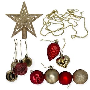 Conteúdo do Pacote: - 01 Kit de Enfeites de Natal com Bolas, Cordão de Pérolas e Estrela - Dourado e Vermelho.