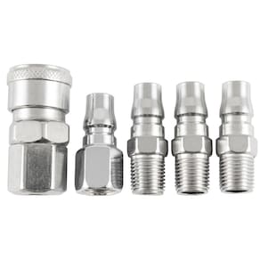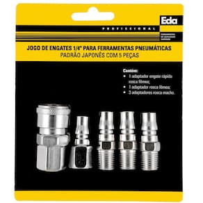 Kit Engate Rápido Adaptador para Ferramentas Pneumáticas 5 Peças Padrão Japonês Eda Profissional - Marca: Importadora Eda - Referência: 0SW - Jogo de engates 1/4 para ferramentas pneumáticas - Padrão japonês. - Fabricadas em aço - 1 Adaptador engate rápido rosca fêmea - 1 Adaptador com rosca fêmea - 3 Adaptadores com rosca macho - Os Adaptadores são indicados para uso na linha industrial, automotiva, pintura automotiva, borracharia, oficina, auto centers, etc - Alta Resistência e Durabilidade - Produto de Qualidade - Garantia: 90 dias