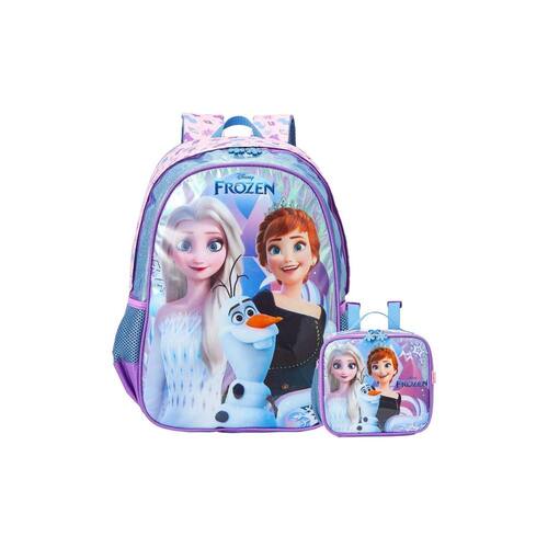 Design exclusivo Frozen com detalhes holográficos: Um show de brilho e magia para as pequenas fãs. Mochila de costas: Conforto e estilo, com alças acolchoadas e reguláveis. Lancheira: Com forro térmico é ideal para guardar lanches e bebidas mantendo a temperatura, com alça regulável. Zíper resistente: Garante maior durabilidade e segurança em todos os itens. Bolsos laterais: Ideais para guardar garrafinhas ou outros objetos pequenos. Alça de mão: Facilita o transporte da mochila e da lancheira.