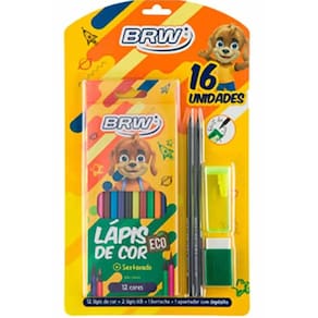 Material: resina termoplástica, lâmina de aço, resina plástica, pigmento, cera e resinas sintéticas plastificantes Contém: 16 unidades, sendo 12 lápis de cor, 2 lápis hb, 1 apontador e 1 borracha com capa Medidas embalagem: 18 x 30 x 1 cm Idade recomendada: 4+ Marca: brw Cód fornecedor: kt1005
